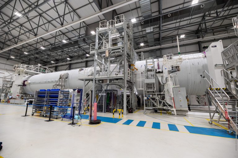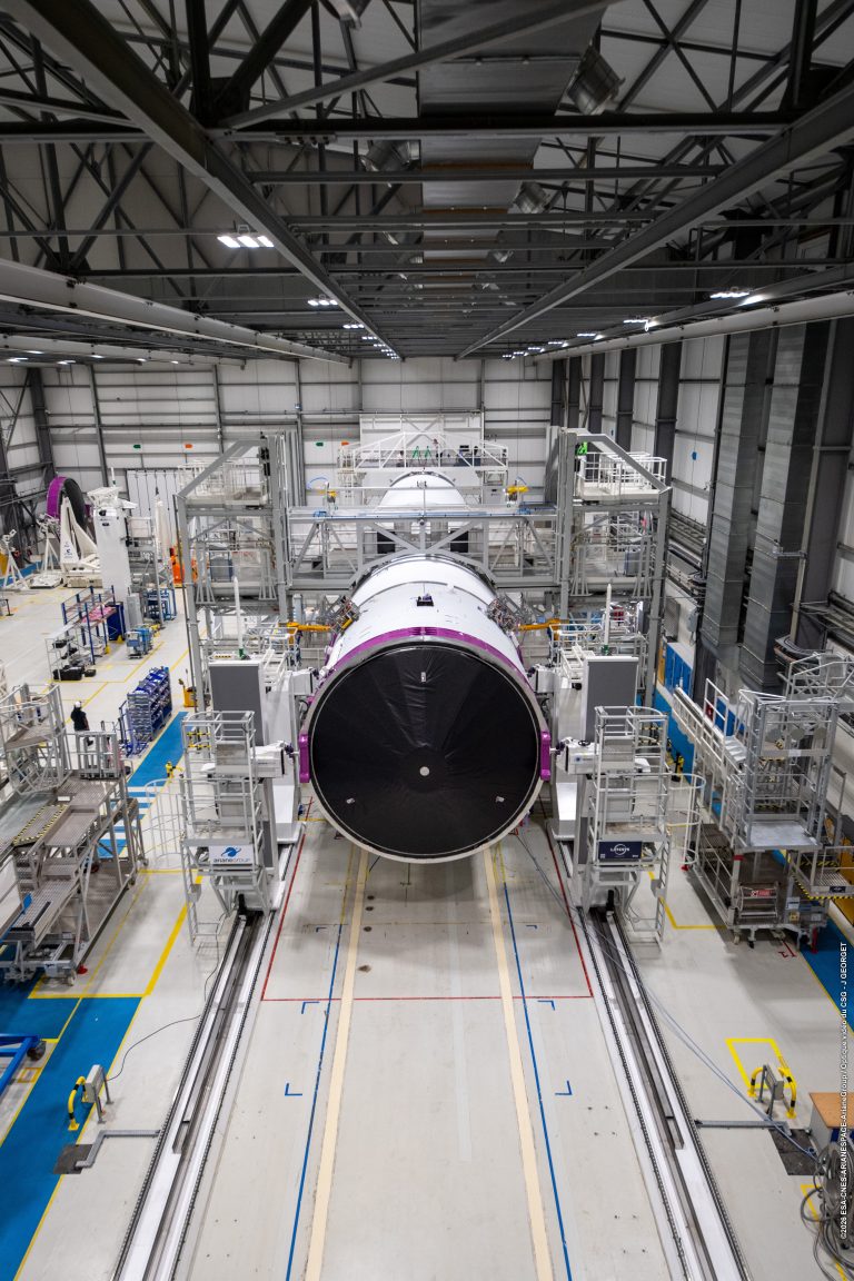 Depuis l’arrivée des étages à Kourou, la campagne de lancement bat actuellement son plein. Les équipes intègrent le corps central et préparent les boosters. En parallèle, les satellites sont en cours d’installation sur le composite supérieur.