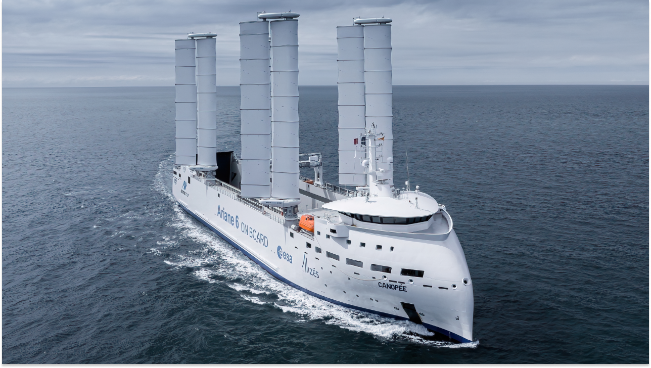 Operated by the French company Alizée, Canopée is the result of a real collective intelligence. The features of this special ship were developed by the design office, VPLP Design, and it was built in Poland, at the Neptune Shipyard. Only one “detail” was missing to make it the cargo ship with the world’s most advanced hybrid system powered by wind: wings adapted to its size. And this challenge was taken up by the French company Ayro, which developed the four Oceanwings® that Canopée has been proudly carrying since this summer. These 37m-high vertical wings are fully automated and can rotate 360° to follow the wind. Significantly more powerful than conventional sails, these wings allow Canopée to maximize the use of wind power and reduce its average annual fuel consumption by around 30%. Capable of carrying 5,000 tons at a speed of 16.5 knots, Canopée will be making a dozen voyages each year between the ports of Bremen, Rotterdam, Le Havre, Bordeaux, and Pariacabo (Europe’s spaceport center).