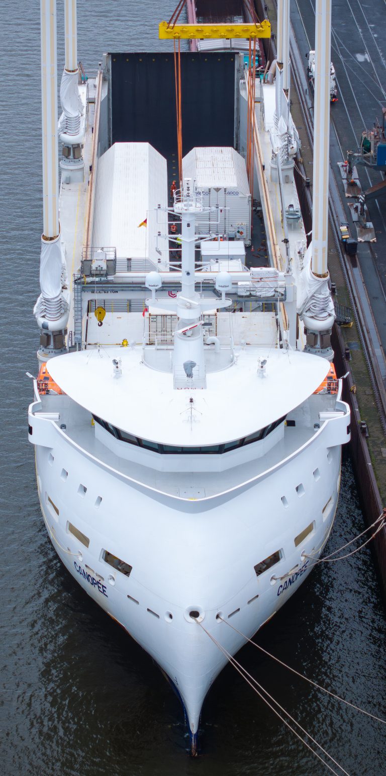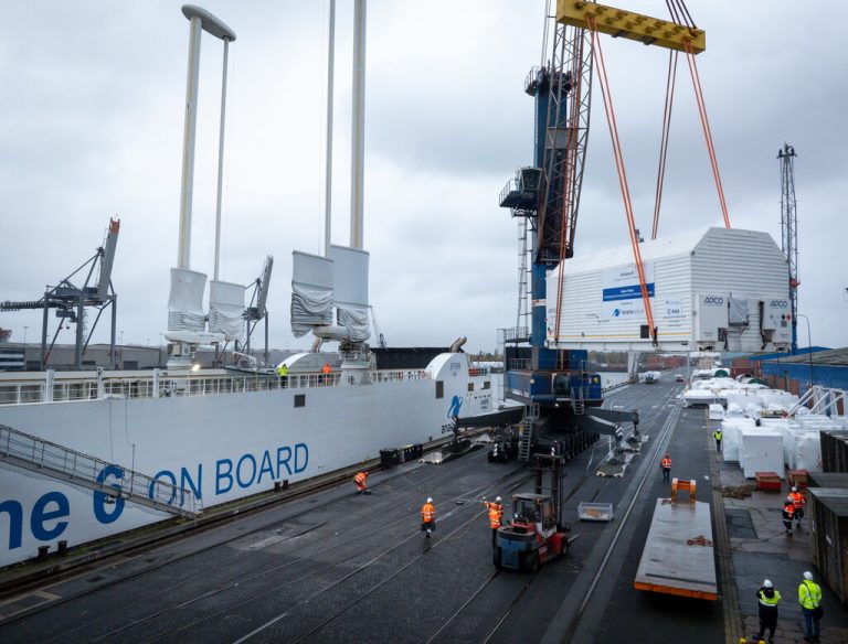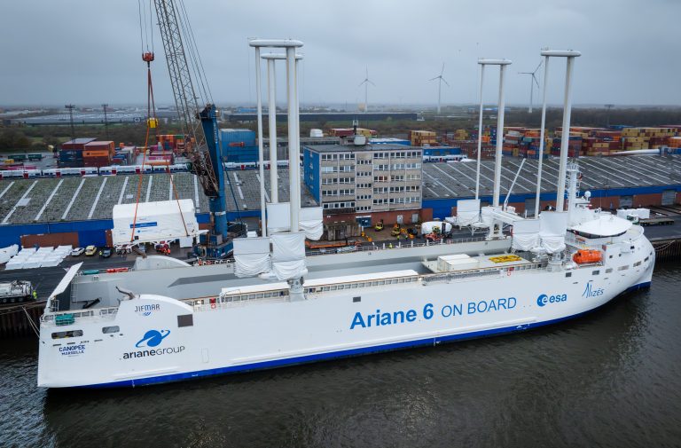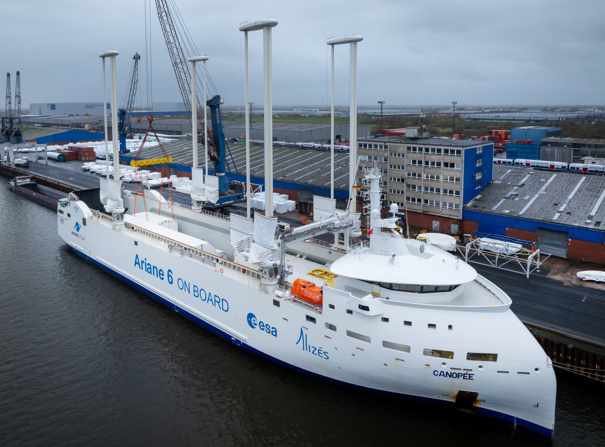 The Canopée sail-assisted cargo vessel loaded the Ariane 6 main stage, which had been integrated at the company’s Les Mureaux site near Paris, in Le Havre in France, then travelled to the port of Bremen in northern Germany to load the upper stage.